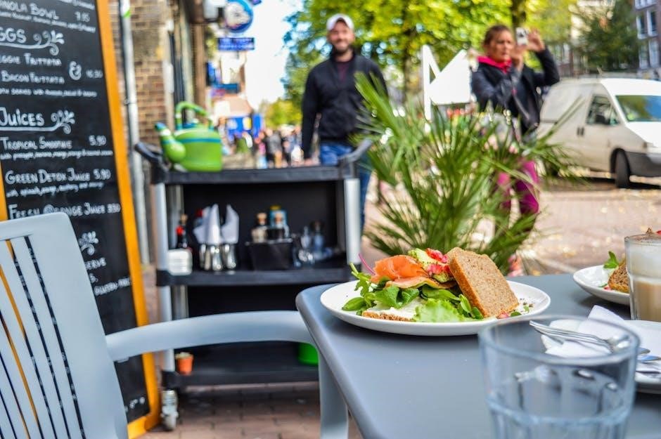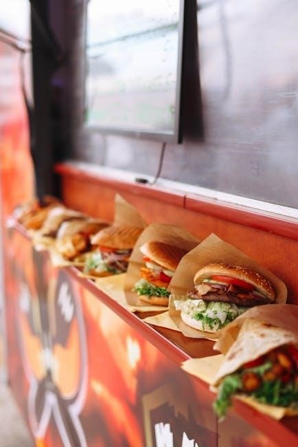 Planning your meal with the Pita Street Food menu PDF is simple and efficient. Customers can browse categories like appetizers‚ mains‚ and desserts‚ or filter by dietary preferences. The menu’s clear layout allows users to mix-and-match options‚ ensuring a balanced meal. Descriptions and images help in making informed choices‚ while pricing is transparent. For convenience‚ customers can mark favorite items digitally or note down orders before visiting. This feature enhances the dining experience‚ making meal planning enjoyable and stress-free.